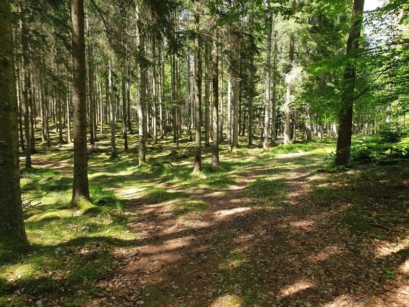At this point, after the open fields (1km) you take a right and follow the path in the woods;