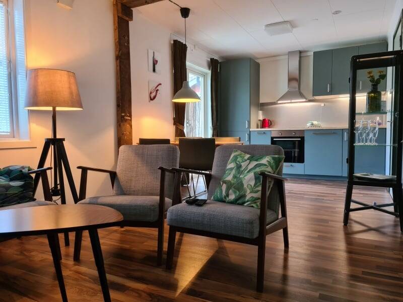 Dieses Apartment befindet sich im Gebäude Eken. Es verfügt über 2 Schlafzimmer, 1 Badezimmer, ein Wohnzimmer mit Küche und eine geräumige überdachte Terrasse mit Blick auf Lagan!